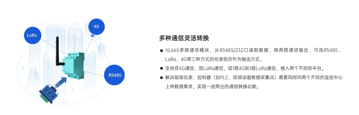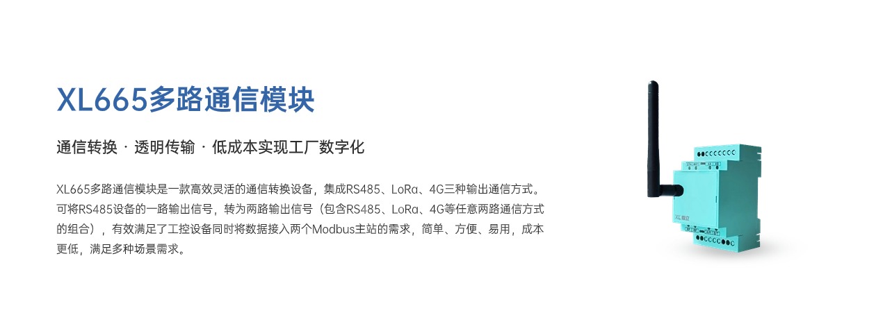 XL665多路通信模塊是一款高效靈活的通信轉(zhuǎn)換設(shè)備,集成RS4852、LoRa、4G三種輸出通信方式??蓪S485設(shè)備的一路輸出信號(hào),轉(zhuǎn)為兩路輸出信號(hào),(包含RS485、LoRa、4G等任意兩路通信方式的組合),有效滿足了工控設(shè)備同時(shí)將數(shù)據(jù)接入兩個(gè)Modbus主站的需求,簡(jiǎn)單、方便、易用,成本更低,滿足多種場(chǎng)景需求。