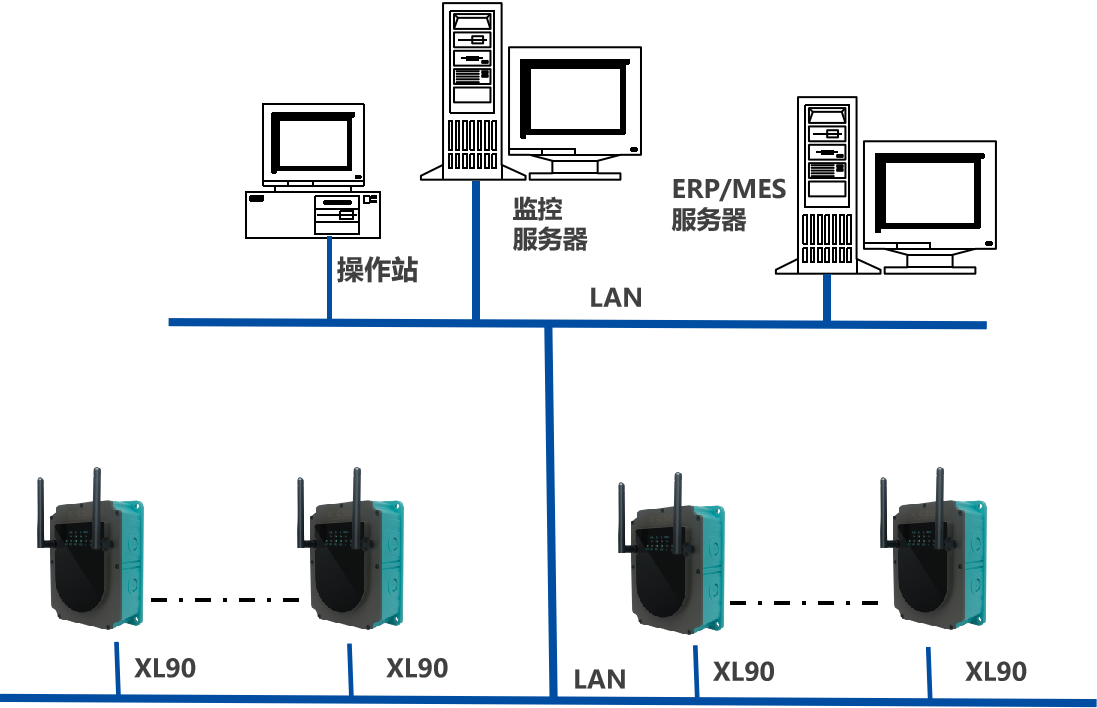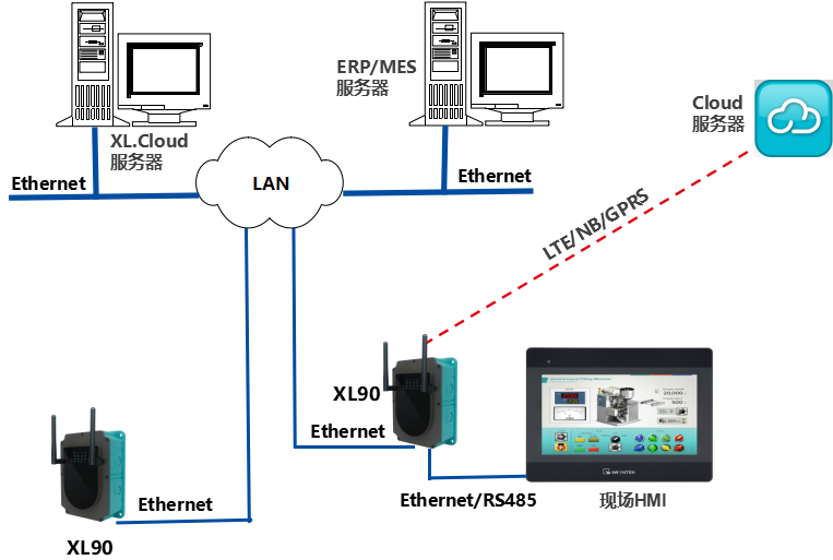 XL90將數(shù)據(jù)轉(zhuǎn)發(fā)給現(xiàn)場(chǎng)HMI;將數(shù)據(jù)上傳給企業(yè)內(nèi)部的多個(gè)系統(tǒng)軟件平臺(tái);通過(guò)LTE(4g)/NB/GPRS將數(shù)據(jù)上傳至云服務(wù)器