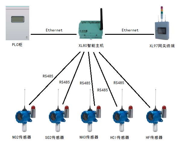 我司廢氣監測系統,選用XL97網關終端。通過采用RS485線的方式將各監測點的數據傳輸至XL80智能主機,智能主機的一個網口通過ETHERNET方式將數據轉發給原有PLC系統;另一網口通過ETHERNET方式將數據上傳至XL97網關終端,網關終端將傳來的數據進行分析處理后,直觀的將各監測點的數據實時顯示出來。