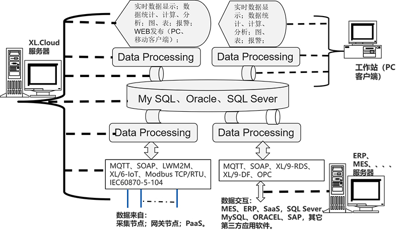 支持MQTT、LWM2M、SOAP,XL/6-IoT、XL/9-DB、XL/9-RDS,等等通信協(xié)議,并可和第三方數(shù)據(jù)庫(kù),Oracle、SAP等交換數(shù)據(jù)