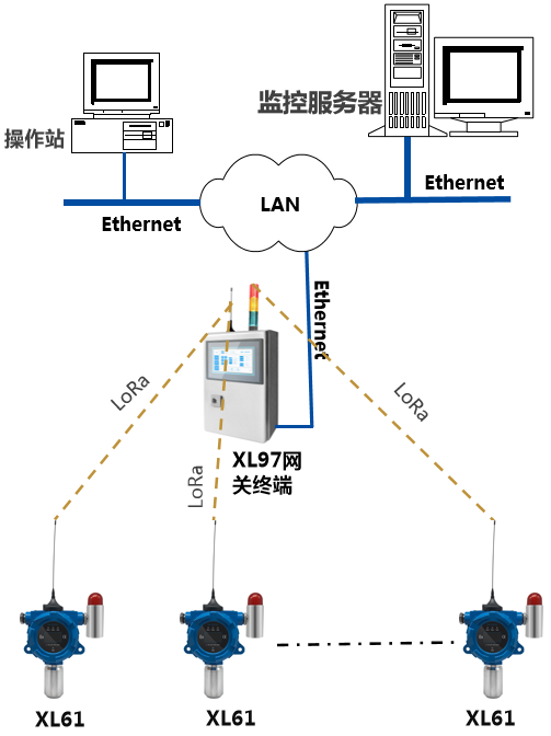 4、如增加現(xiàn)場(chǎng)集中監(jiān)控點(diǎn),可配置XL97網(wǎng)關(guān)終端,讀取區(qū)域內(nèi)XL61上傳的數(shù)據(jù),分析處理、顯示、報(bào)警,并轉(zhuǎn)發(fā)至監(jiān)控中心服務(wù)器。