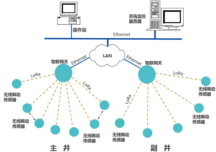 在主井、副井各安裝1臺物聯網關,無線讀取振動傳感器的數據,通過LAN(局域網),上專數據到監控服務器;